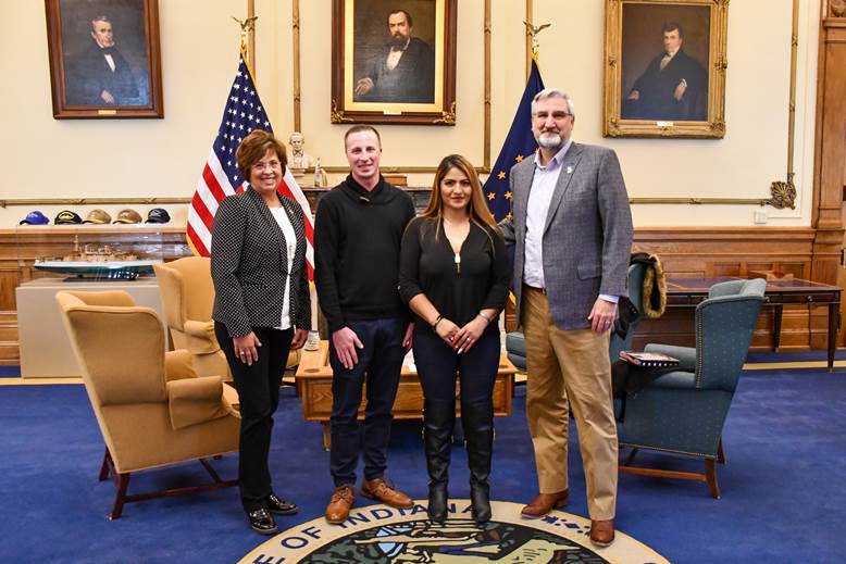 ABOVE: State Sen. Stacey Donato (R-Logansport) presents a state flag to Corporal Humberto Sanchez’s family after passing Senate Concurrent Resolution 12 on Jan. 31. SCR 12 urges the Indiana Department of Transportation to name each bridge crossing the Wabash River on State Road 25 near Biddle’s Island in Logansport, IN, the “Corporal Humberto A. Sanchez Memorial Bridge.”