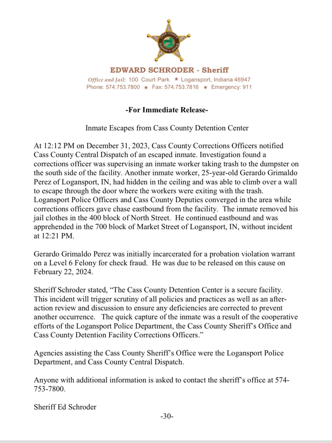 At 12:12 p.m. on December 31, 2023, Cass County Corrections Officers notified Cass County Central Dispatch of an escaped inmate. Investigation found a corrections officer was supervising an inmate worker taking trash to the dumpster on the south side of the facility. Another inmate worker, 25-year-old Gerardo Grimaldo Perez of Logansport, IN, had hidden in the ceiling and was able to climb over a wall to escape through the door where the workers were exiting with the trash.