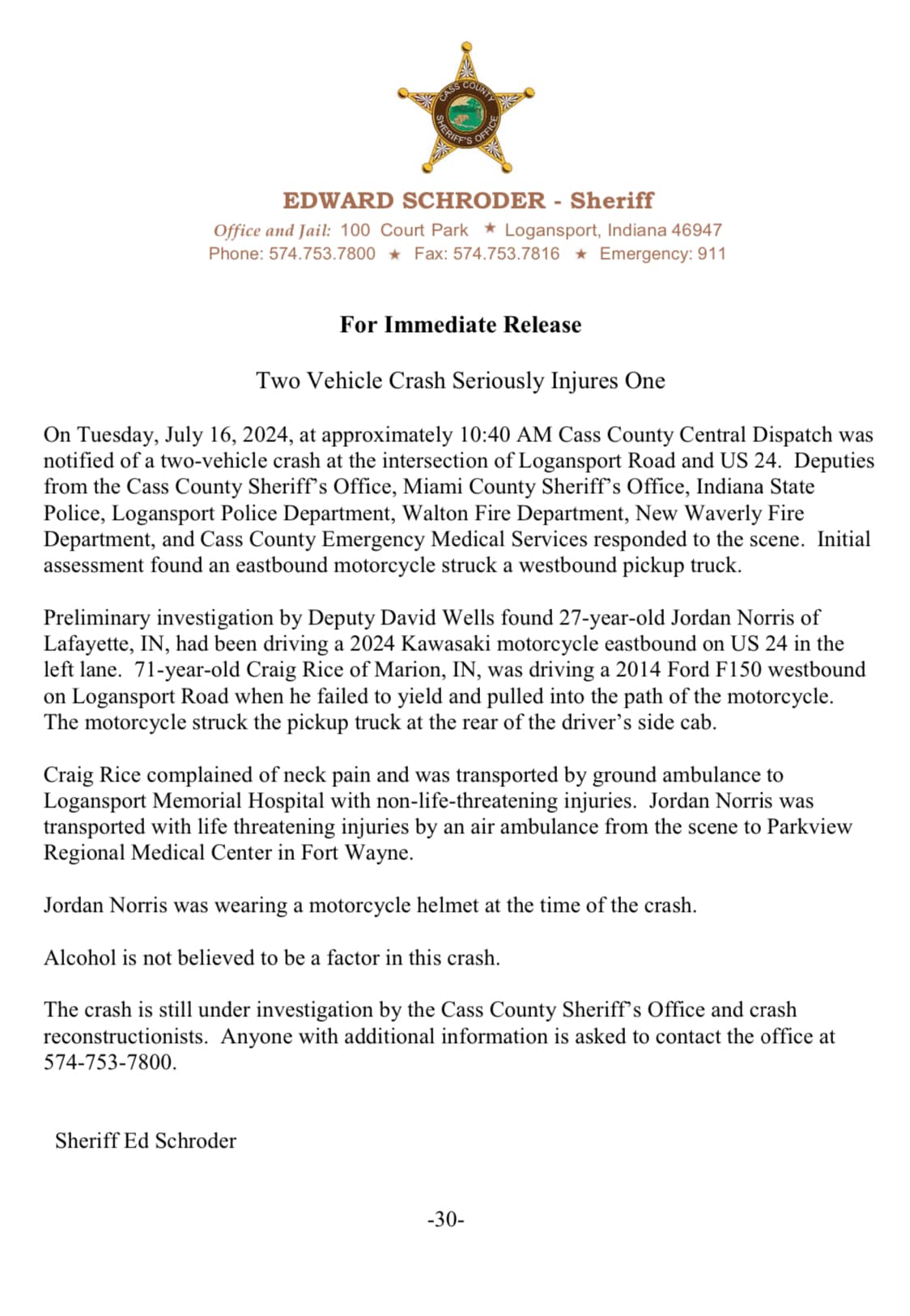 On Tuesday, July 16, 2024, at approximately 10:40 AM Cass County Central Dispatch was notified of a two-vehicle crash at the intersection of Logansport Road and US 24. Deputies from the Cass County Sheriff’s Office, Miami County Sheriff’s Office, Indiana State Police, Logansport Police Department, Walton Fire Department, New Waverly Fire Department, and Cass County Emergency Medical Services responded to the scene. Initial assessment found an eastbound motorcycle struck a westbound pickup truck.