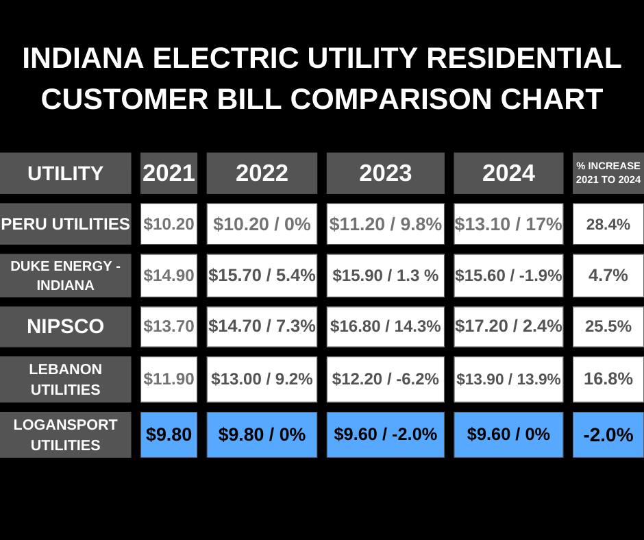 Logansport Utilities remains at the bottom of electric rates in comparison with other Indiana electric service providers.