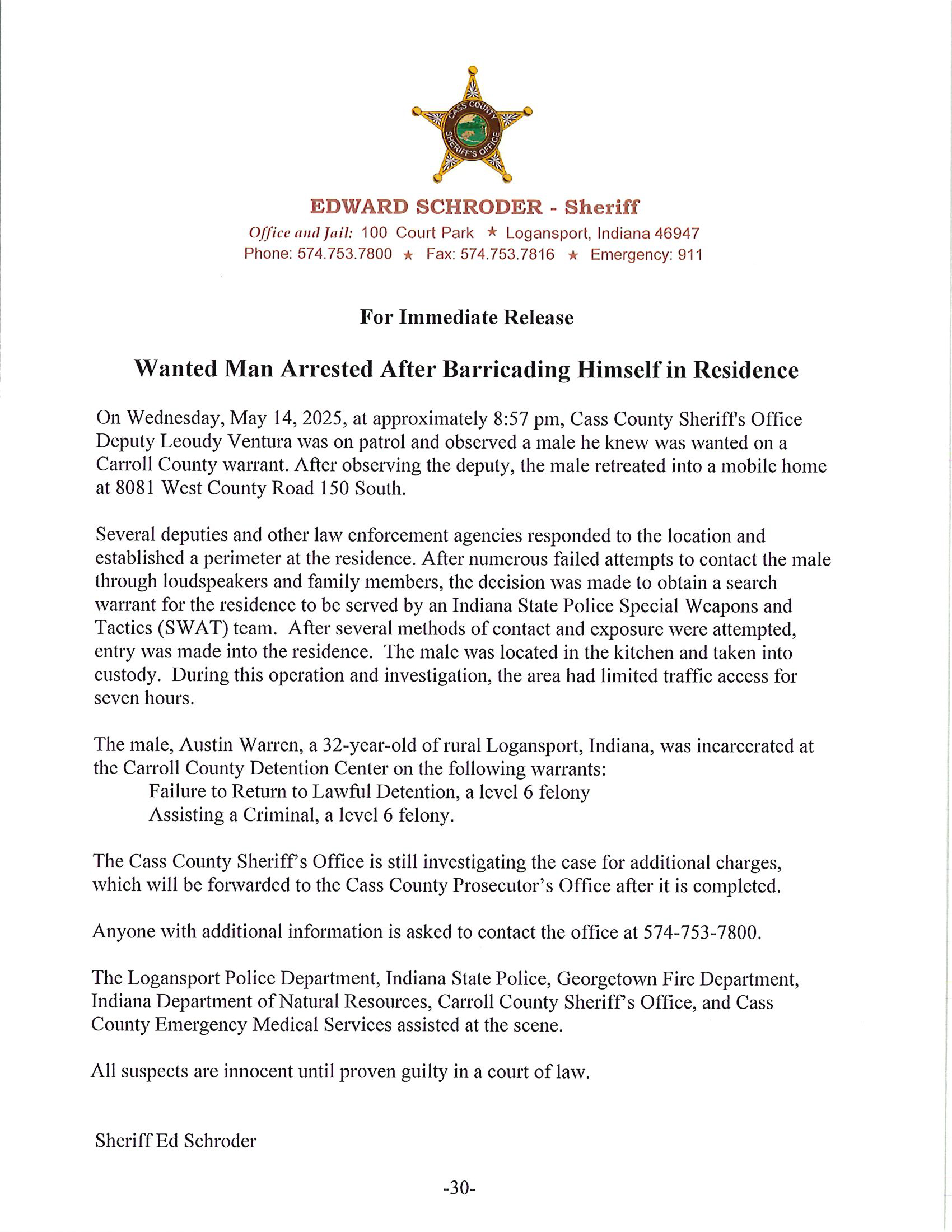On Wednesday, May 14, 2025 at approximately 8:57 p.m., Cass County Sheriff’s Office Deputy Leoudy Ventura was on patrol and observed a male he knew was wanted on a Carroll County warrant. After observing the deputy, the male retreated into a mobile home at 8081 West County Road 150 South.