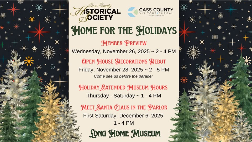 The Cass County Carousel will be open both Friday, November 28, and Saturday November 29, 2025 from 1-5 p.m. The Cass County Community Foundation’s “Thanks-for Giving” Grant will provide funds to be used to pay the expenses for the Carousel’s Friday and Saturday opening after the Thanksgiving holiday and will allow all rides to be free. | More info