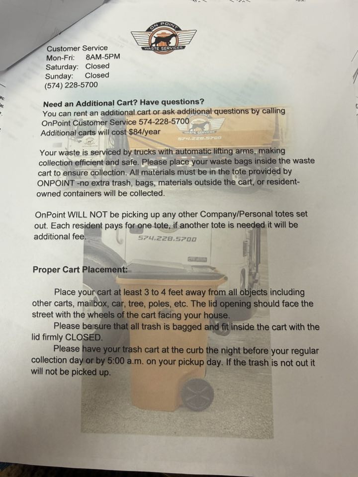 For the year 2026, our Trash Service will be with ONPOINT. ONPOINT will be delivering each resident 1 toter per home on December 26 or 27, we will know more the closer it gets. Our first trash pickup day will be on Friday, January 2, 2026 due to the Holiday. Our Trash will continue to be picked up on Thursday unless there is a holiday on said day. (Each home will be provided with one trash container to use for trash services. If additional trash containers are needed, ONPOINT can provide for an additional fee ($84/year).