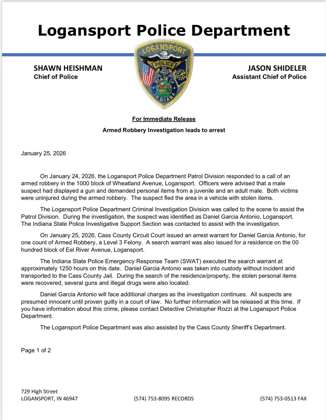 On January 25, 2026, Cass County Circuit Court issued an arrest warrant for Daniel Garcia Antonio, for one count of Armed Robbery, a Level 3 Felony. A search warrant was also issued for a residence on the 00