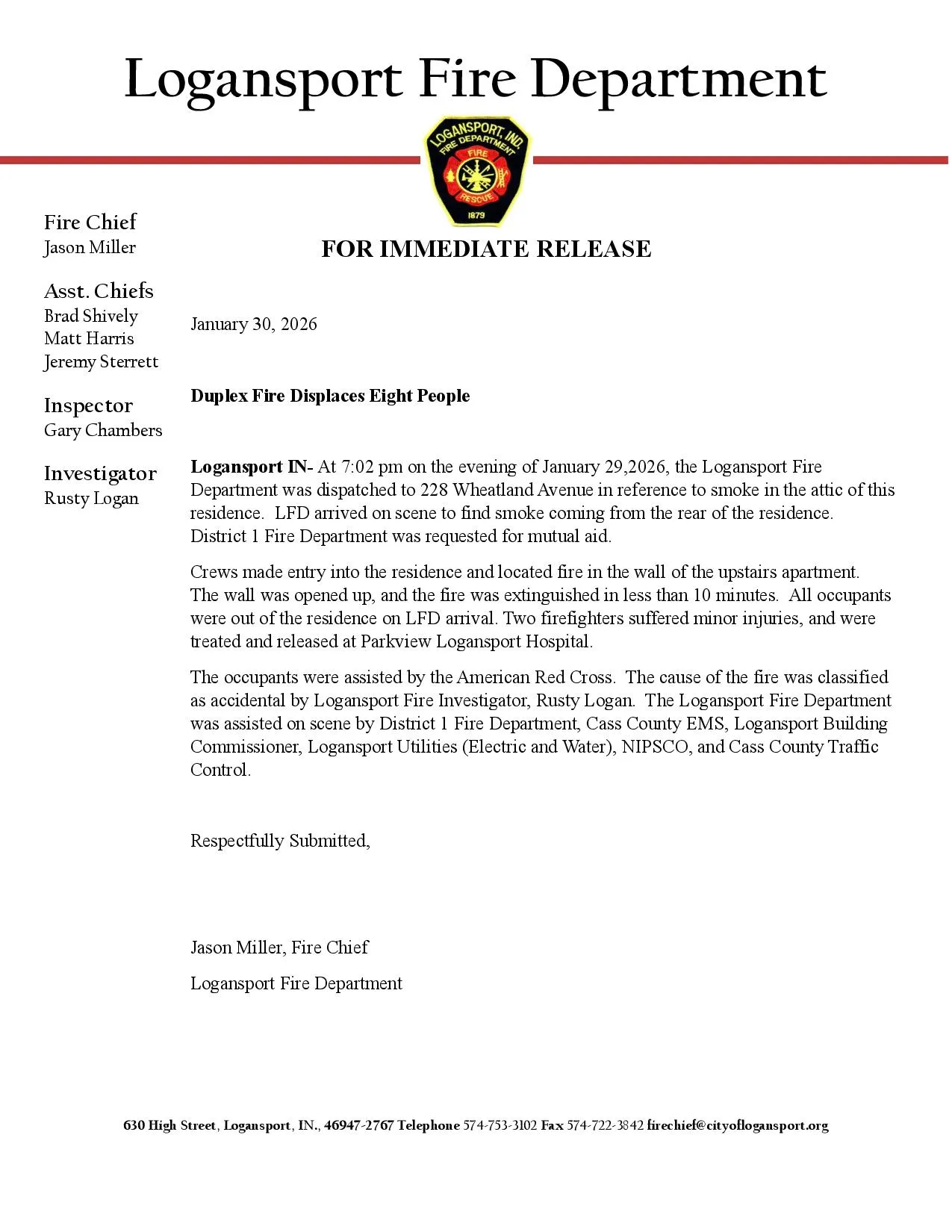 The occupants were assisted by the American Red Cross. The cause of the fire was classified as accidental by Logansport Fire Investigator, Rusty Logan. The Logansport Fire Department was assisted on scene by District 1 Fire Department, Cass County EMS, Logansport Building Commissioner, Logansport Utilities (Electric and Water), NIPSCO, and Cass County Traffic Control.