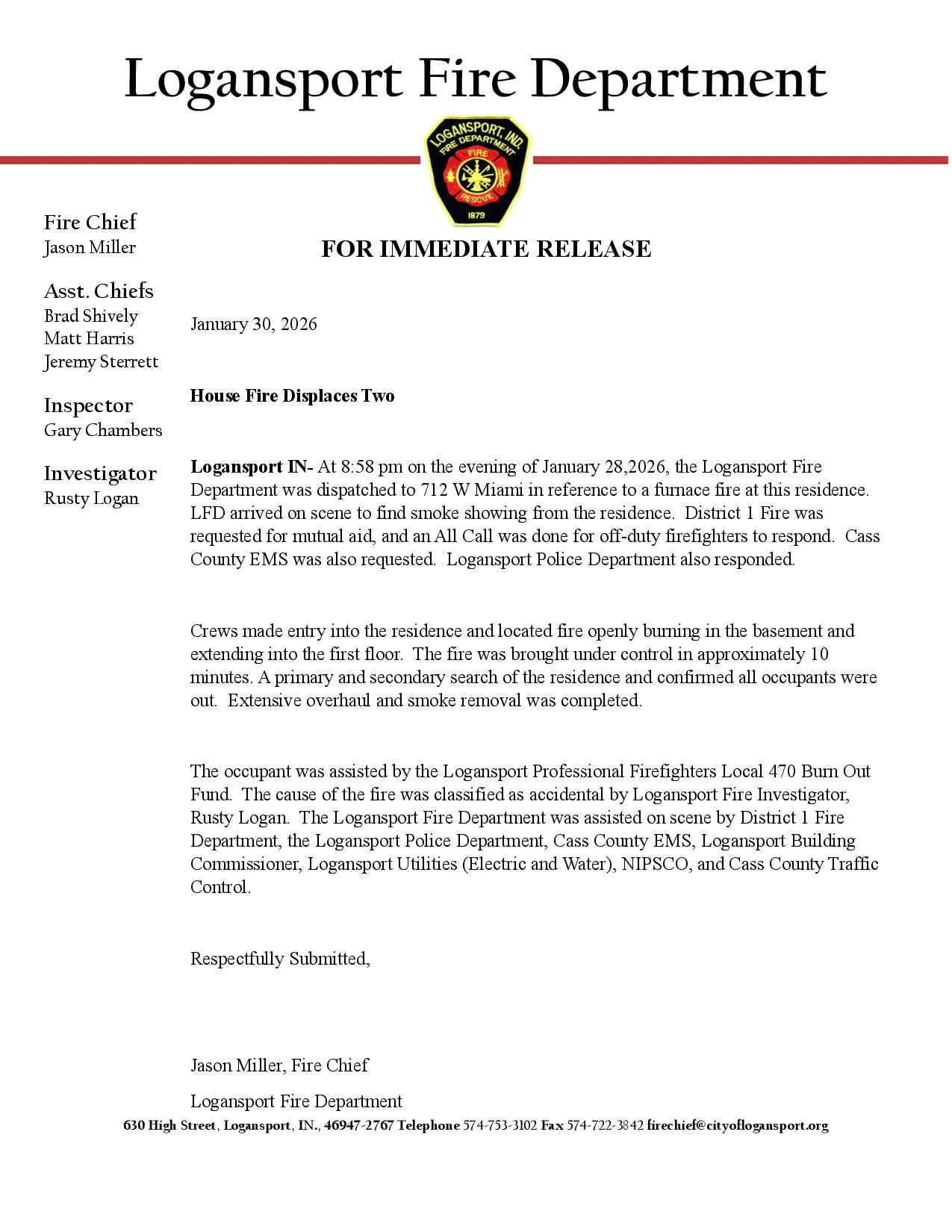The occupant was assisted by the Logansport Professional Firefighters Local 470 Burn Out Fund. The cause of the fire was classified as accidental by Logansport Fire Investigator, Rusty Logan. The Logansport Fire Department was assisted on scene by District 1 Fire Department, the Logansport Police Department, Cass County EMS, Logansport Building Commissioner, Logansport Utilities (Electric and Water), NIPSCO, and Cass County Traffic Control.