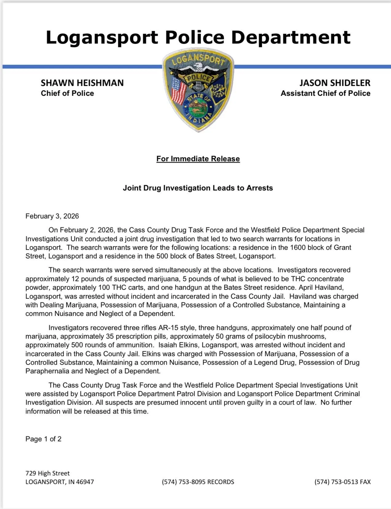 On February 2, 2026, the Cass County Drug Task Force and the Westfield Police Department Special Investigations Unit conducted a joint drug investigation that led to two search warrants for locations in Logansport. The search warrants were for the following locations: a residence in the 1600 block of Grant Street, Logansport and a residence in the 500 block of Bates Street, Logansport.