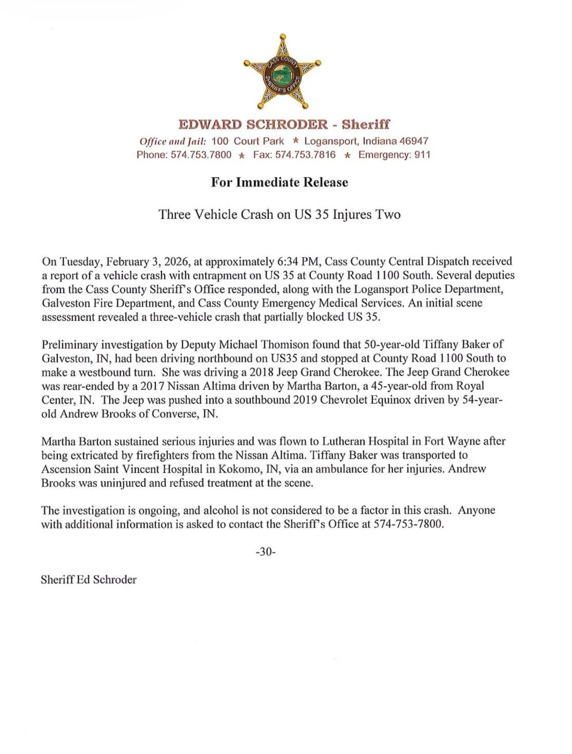 On Tuesday, February 3, 2026, at approximately 6:34 p.m, Cass County Central Dispatch received a report of a vehicle crash with entrapment on US 35 at County Road 1100 South. Several deputies from the Cass County Sheriff’s Office responded, along with the Logansport Police Department, Galveston Fire Department, and Cass County Emergency Medical Services. An initial scene assessment revealed a three-vehicle crash that partially blocked US 35.