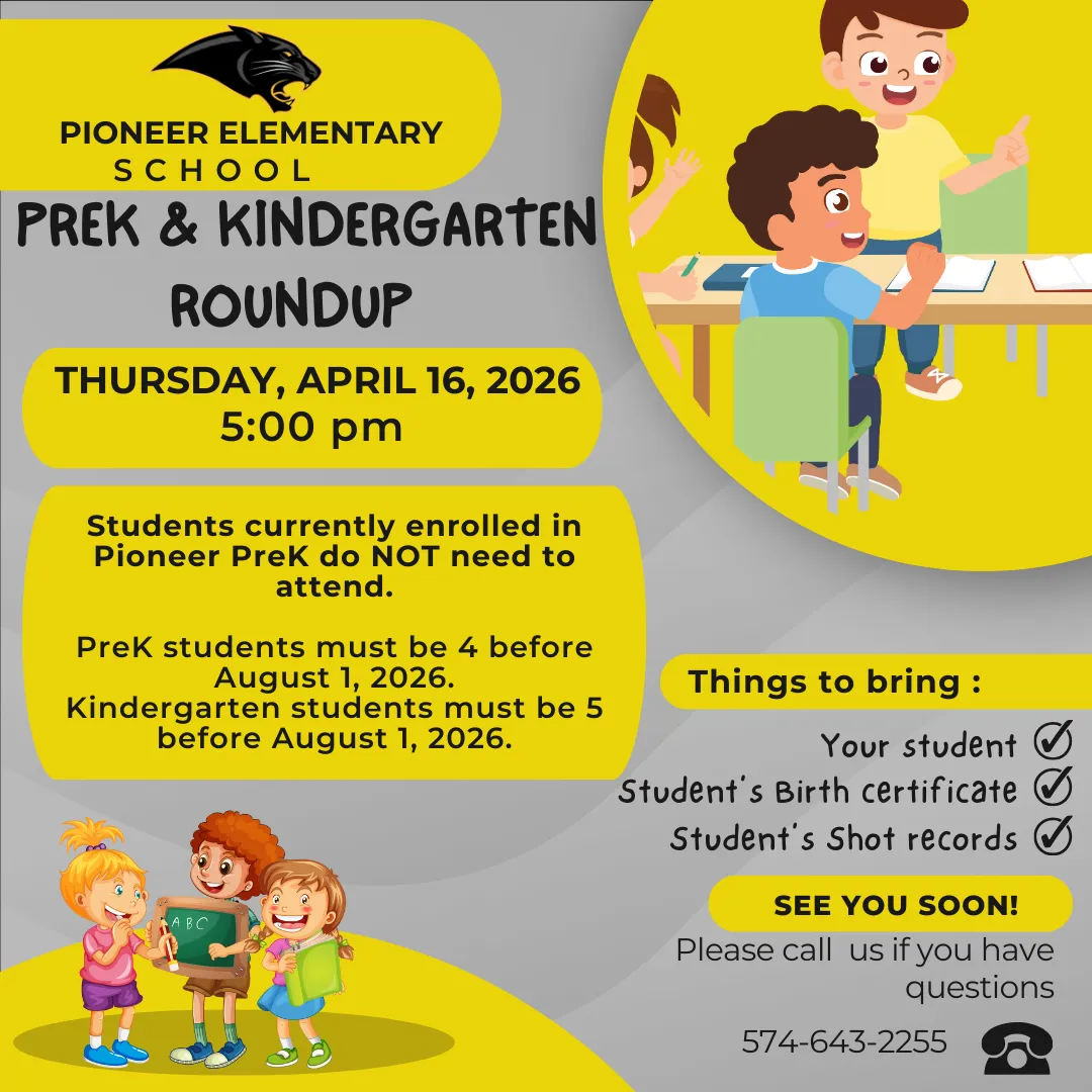 🐾PIONEER ELEMENTARY: Kindergarten Roundup will be Thursday, April 16, 2026 at 5 p.m.
