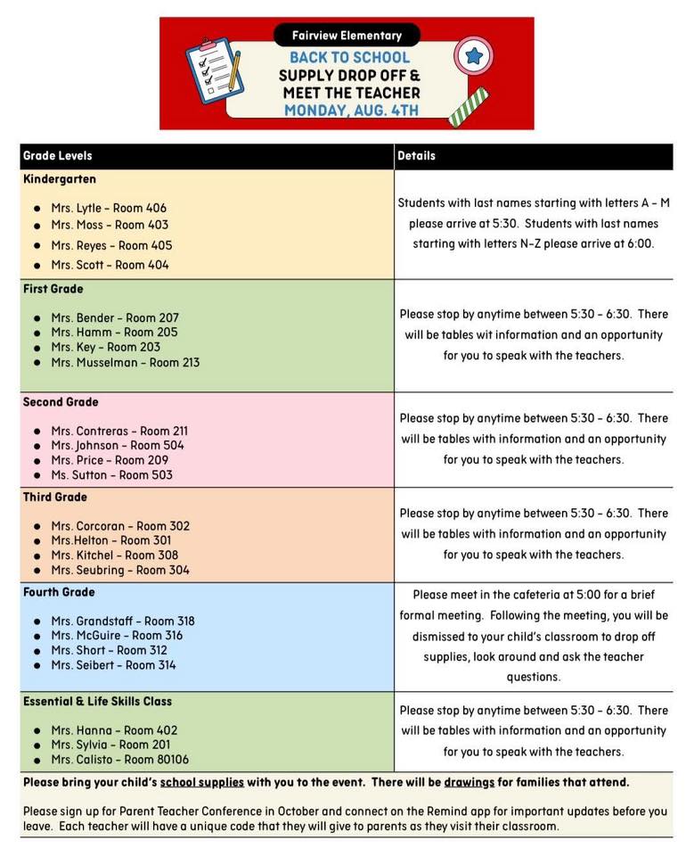 Fariview Back to School Supply Drop Off & Meet the Teacher – Monday, August 4, 2025