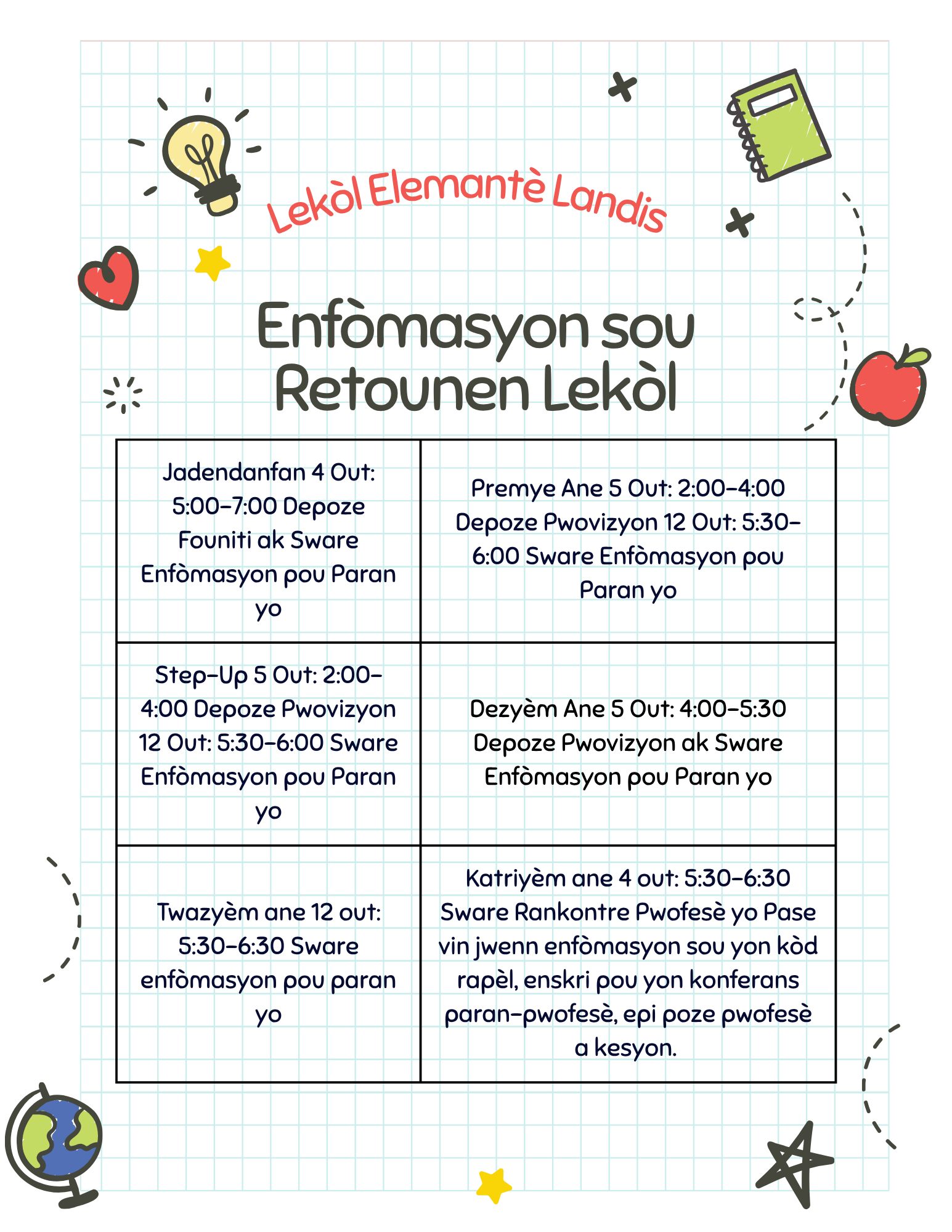 Kindergarten • Mrs. Lytle – Room 406 • Mrs. Moss – Room 403 • Mrs. Reyes – Room 405 • Mrs. Scott – Room 404 | Students with last names starting with letters A–M please arrive at 5:30. Students with last names starting with letters N–Z please arrive at 6:00. |