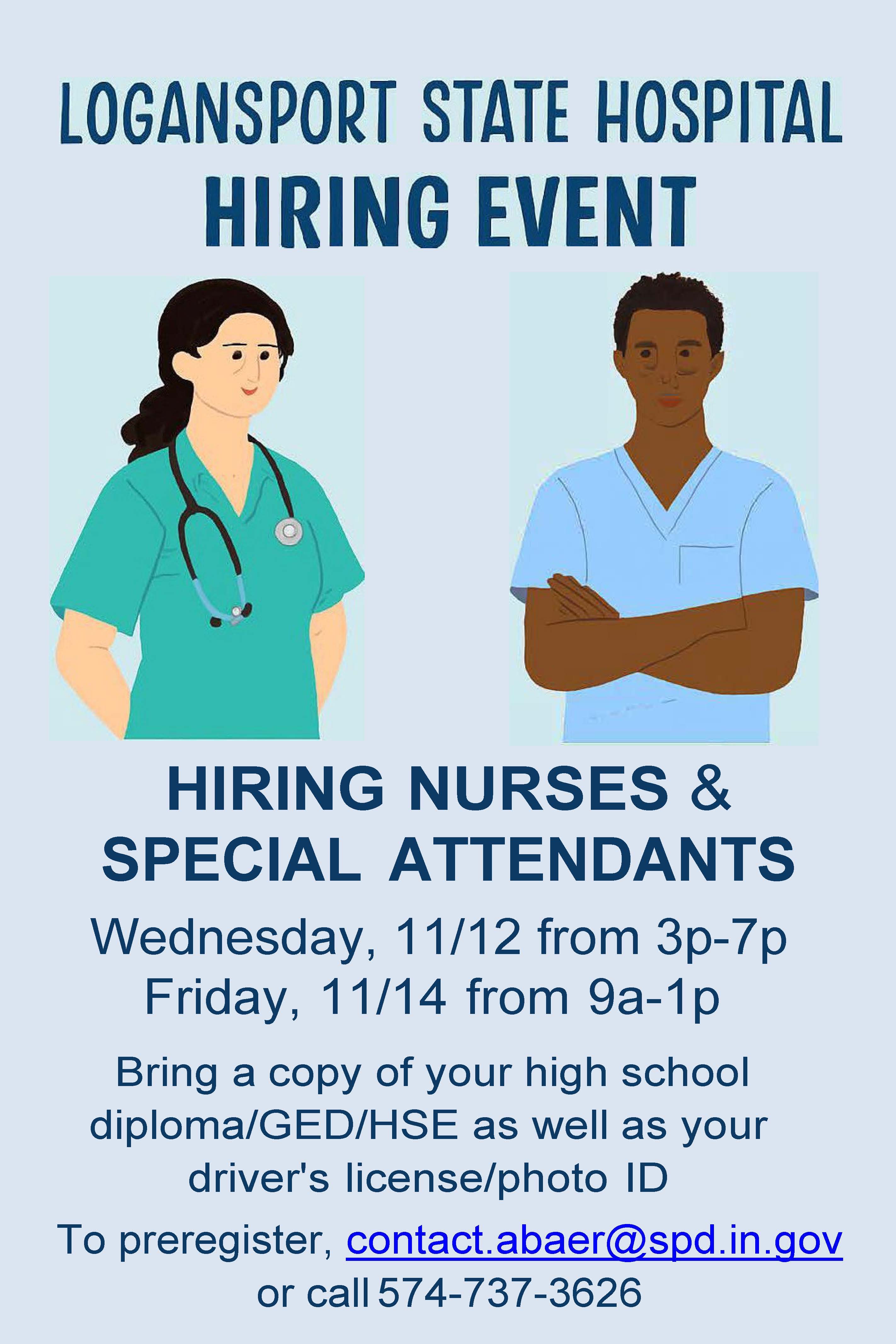 Hiring Event 11/12 3p-7p and 11/14 9a-1p at Logansport State Hospital for nurses and special attendants. Come prepared to interview! Please bring your photo ID and a copy of your diploma or transcripts. Nurses, please bring a copy of your nursing license. For more info, please call 574-737-3626 or email abaer@spd.in.gov