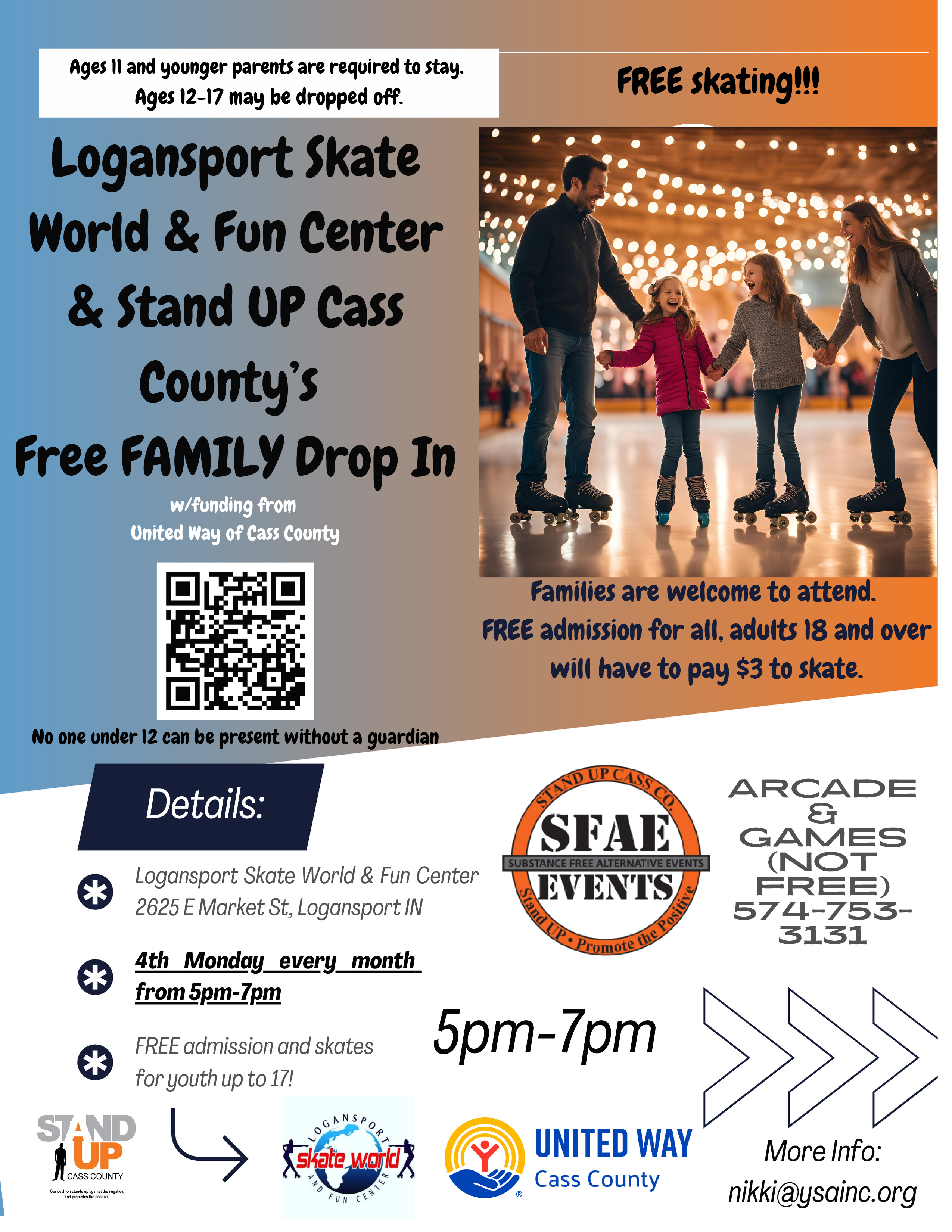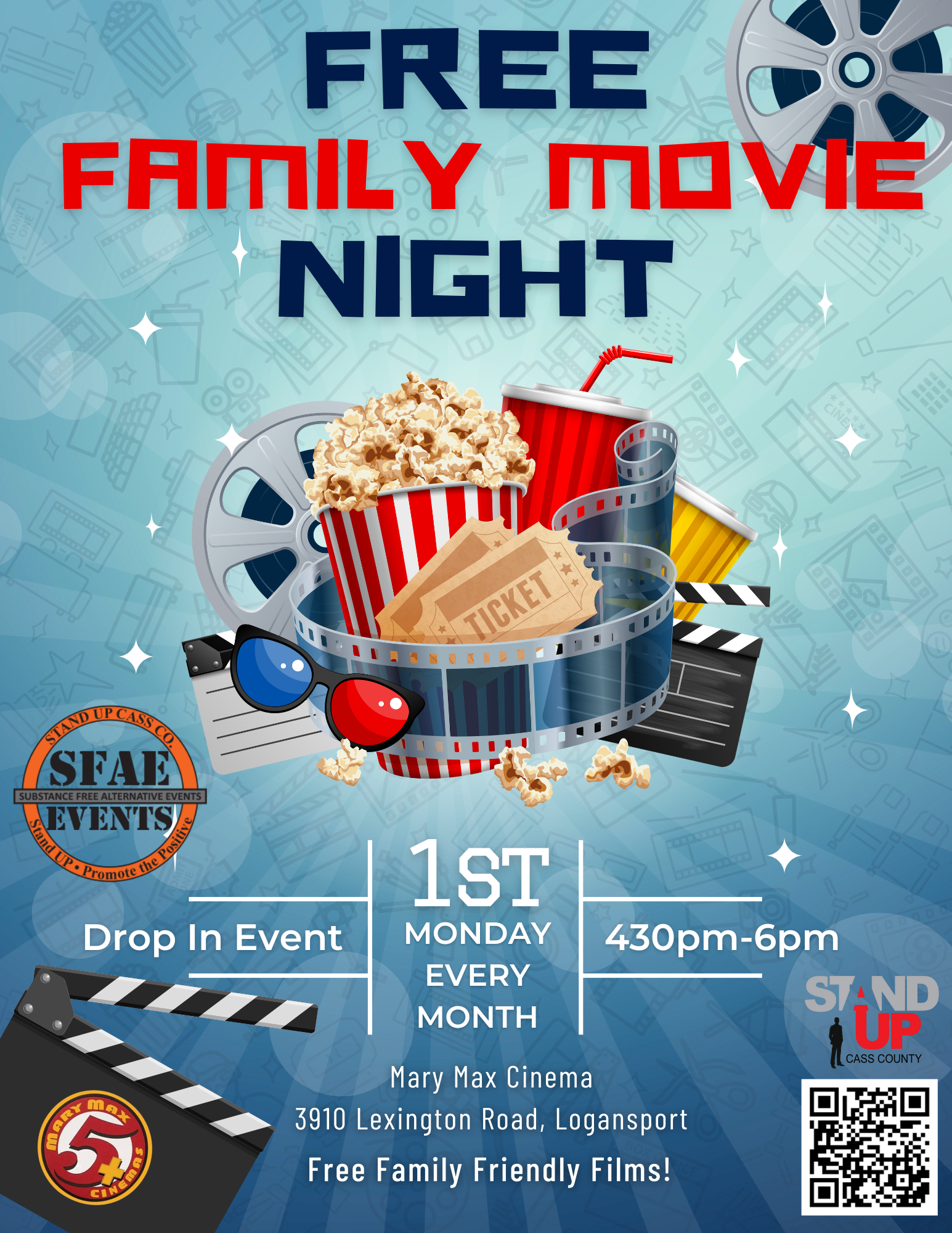 Stand UP Cass County offers free family events at Mary Max Cinemas, Black Dog Coffee and Logansport Skate World. Find more information on their website and Facebook page.