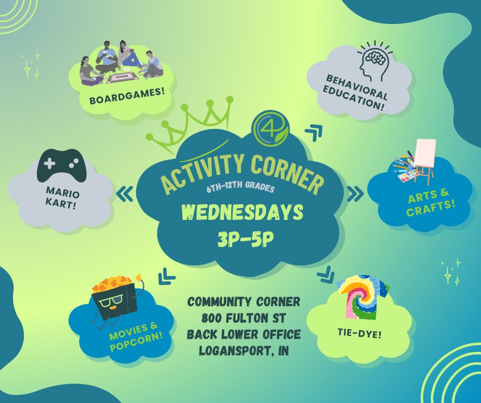 Welcome to any youth in grades 6th thru 12th at 4C Health Community Corner on Wednesdays from 3-5 p.m. Free for any youth to come into an adult monitored, free safe space for the youth to engage in positive peer interactions with others.
