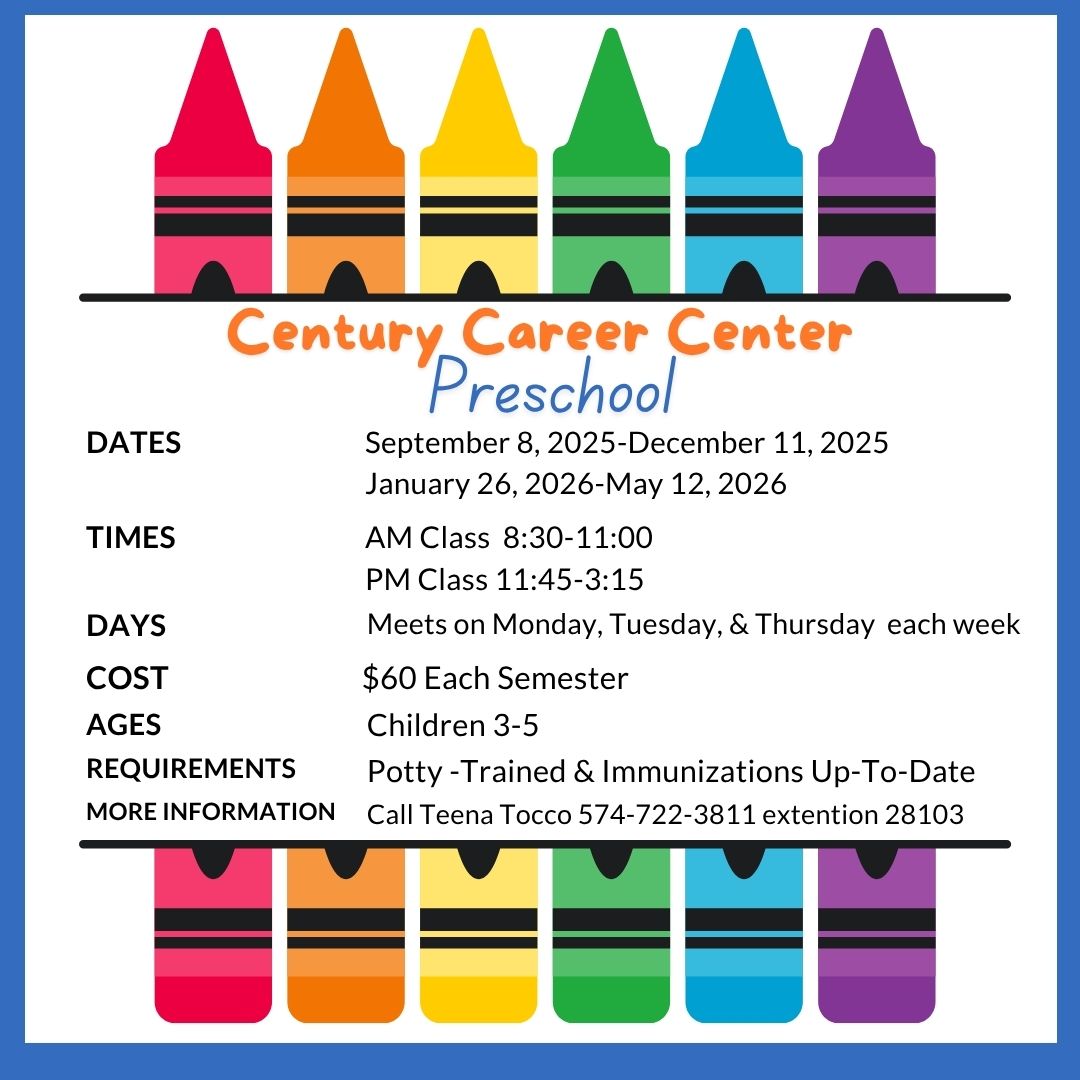 Children need to be between the ages of 3-5 and potty trained. If you are interested, please call Teena Tocco at the Century Career Center 574-722-3811 Extension 28103 for more information.