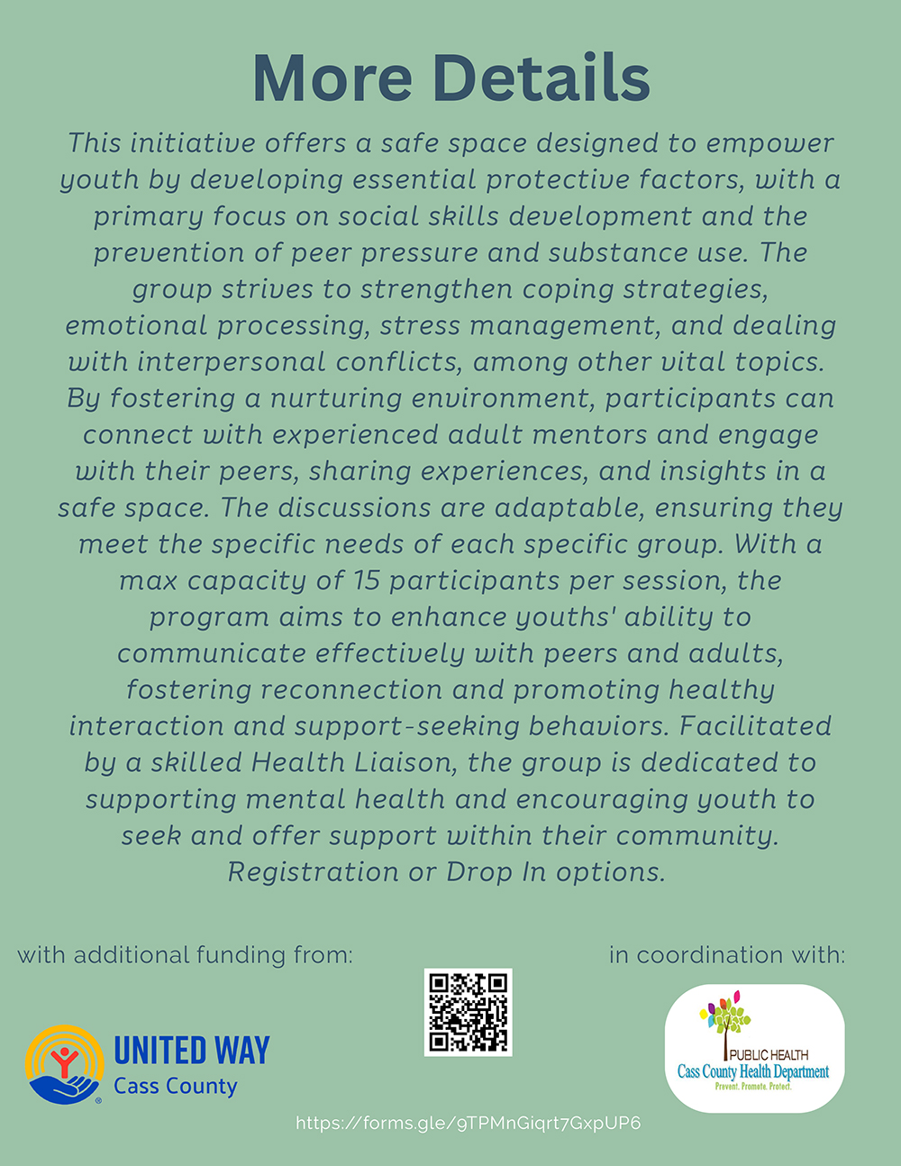 This initiative offers a safe space designed to empower youth by developing essential protective factors, with a primary focus on social skills development and the prevention of peer pressure and substance use. The group strives to strengthen coping strategies, emotional processing, stress management, and dealing with interpersonal conflicts, among other vital topics.