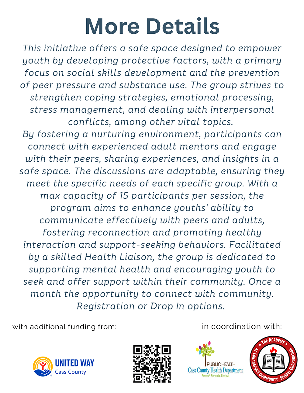 These groups are sponsored by Project HOPE 929 Inc., in cooperation with the Cass County Health Department. Thanks to funding provided by Partners for a Drug Free Cass County and United Way of Cass County.