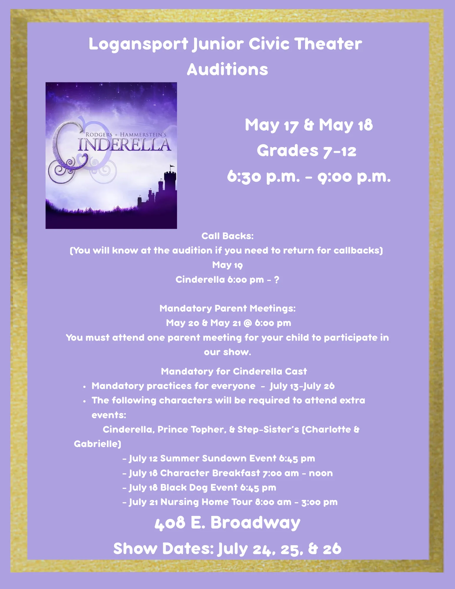 Logansport Junior Civic Theater auditions for Cinderella (Grades 7-12) on May 17 & May 18, 2026