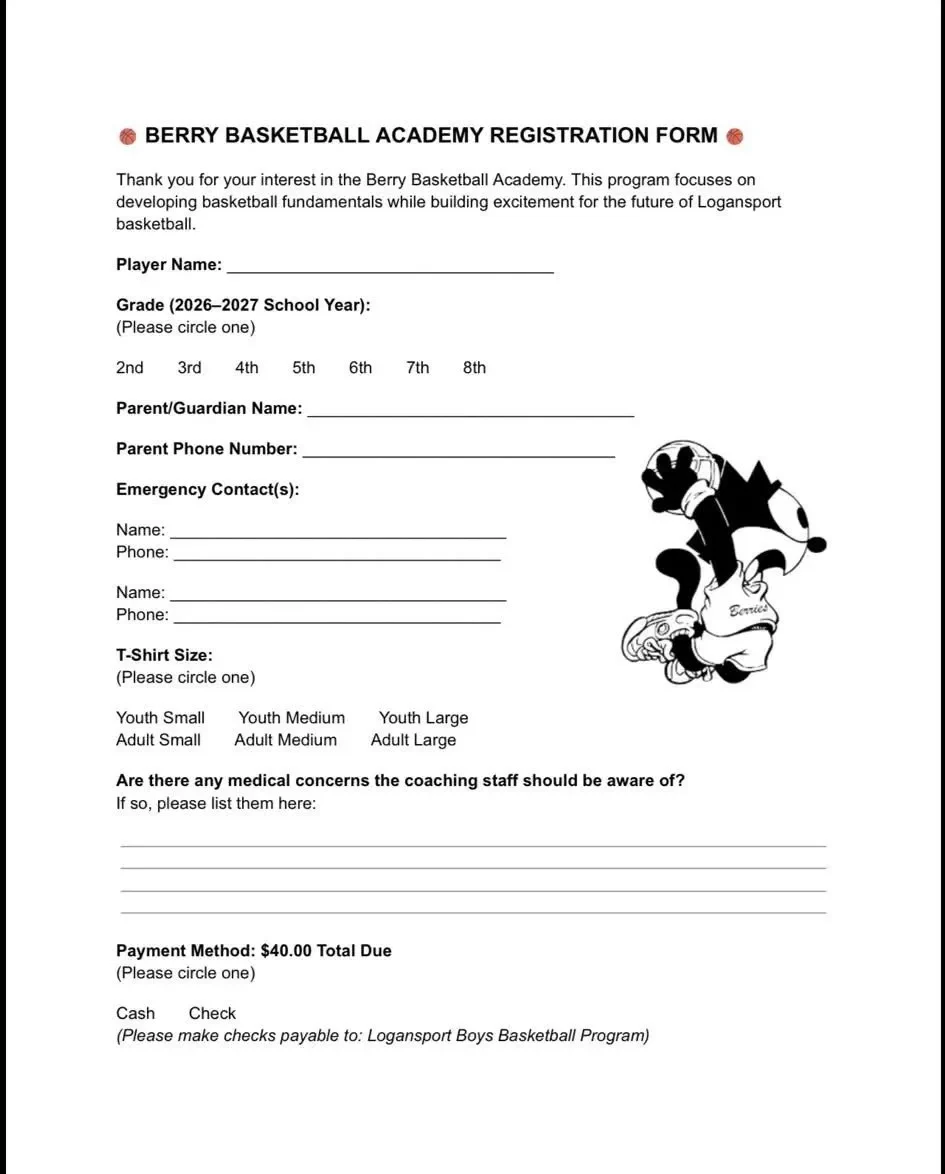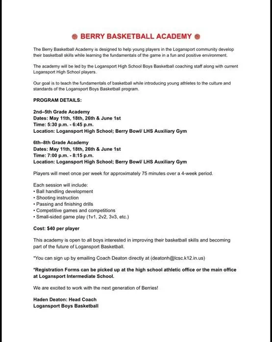 The Berry Basketball Academy is designed to help young players in the Logansport community develop their basketball skills while learning the fundamentals of the game in a fun and positive environment.