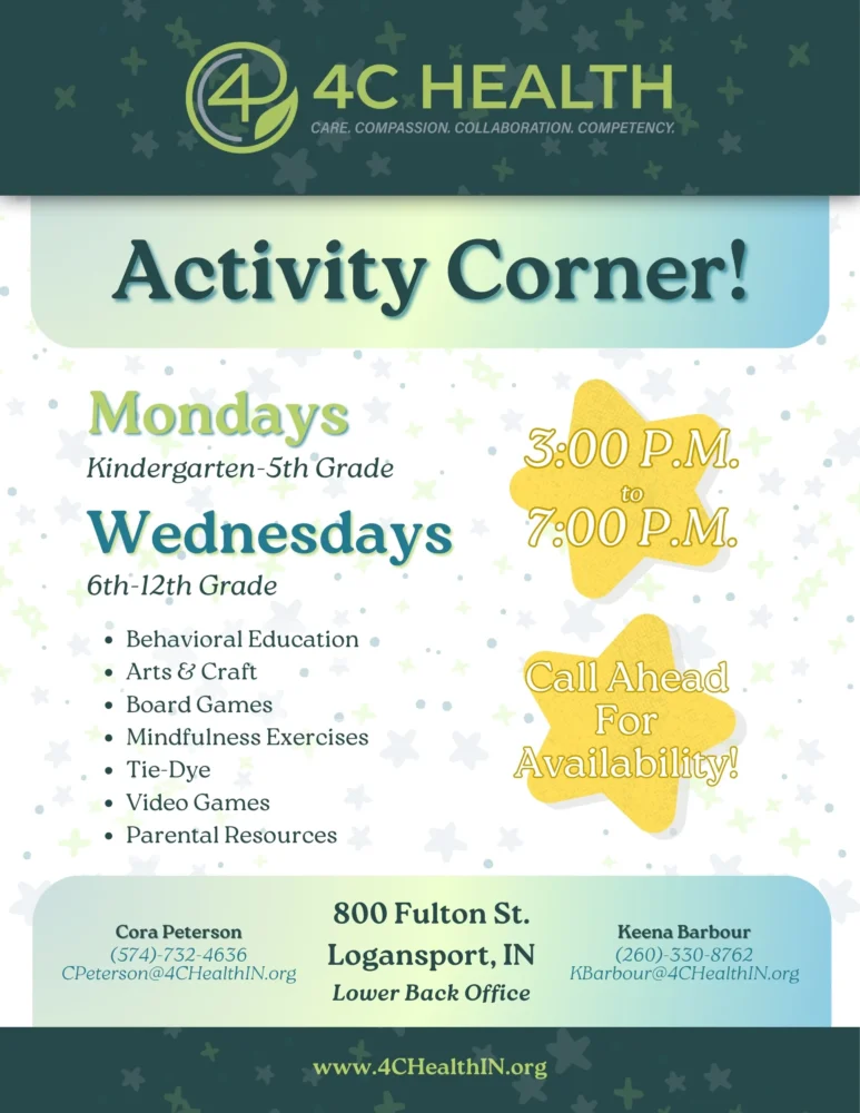 Behavioral education, arts and crafts, board games, mindfulness exercises, tie-dye, video games, parental resources at 4C Health Community Corner, 800 Fulton St. in Logansport.