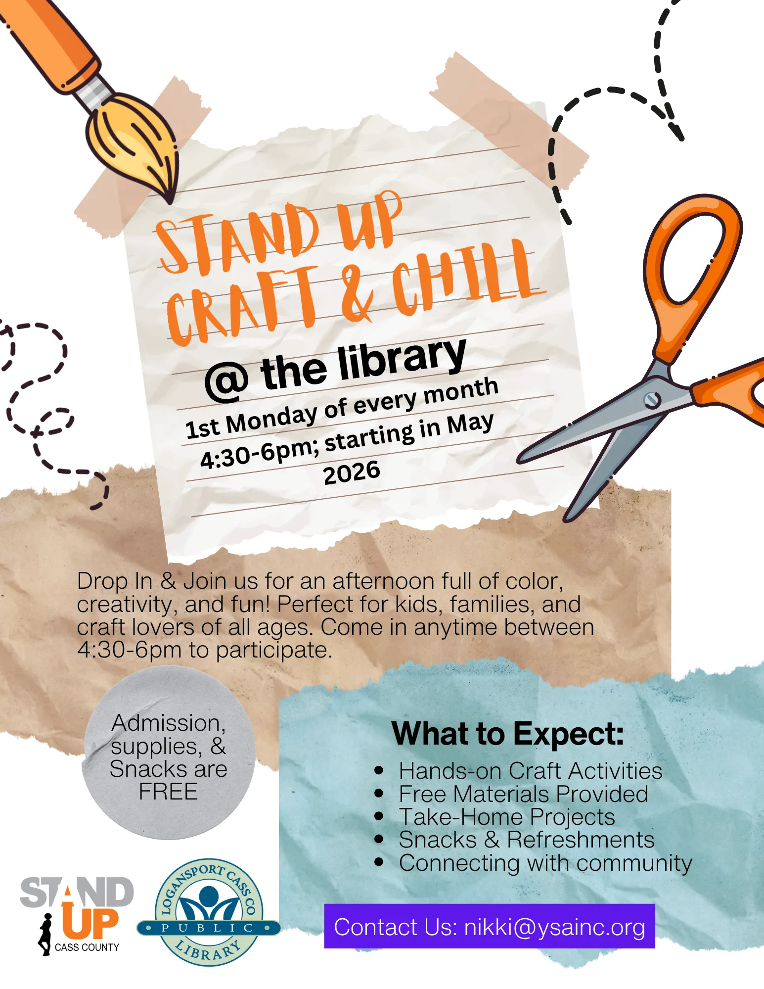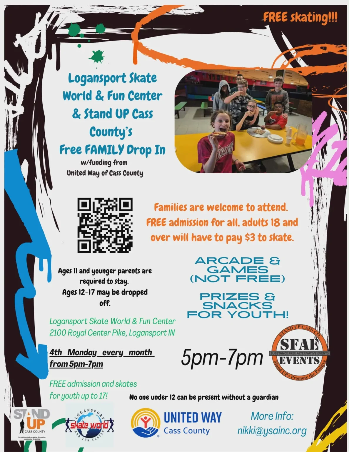 Stand UP Cass County offers free family events at Black Dog Coffee, Logansport Skate World, and the Logansport Library. Find more information on their website and Facebook page.