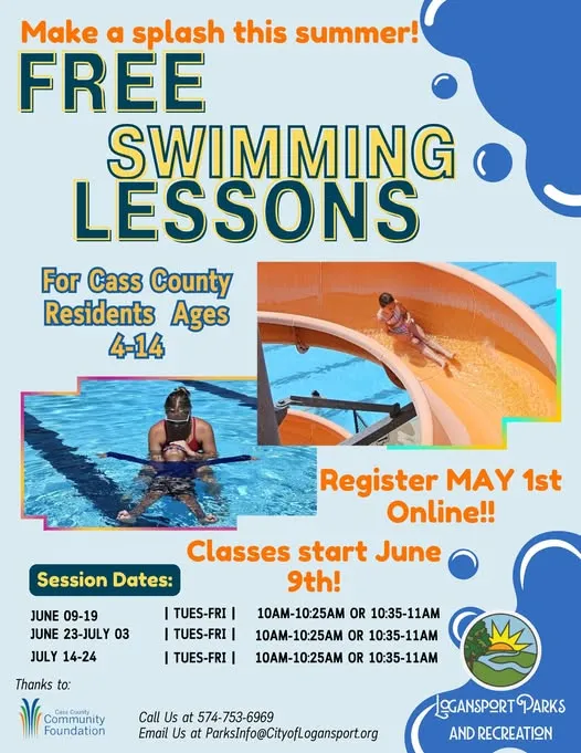 For the FIRST TIME, Logansport Parks is offering FREE swim lessons for kids ages 4-14 thanks to the Cass County Community Foundation!!